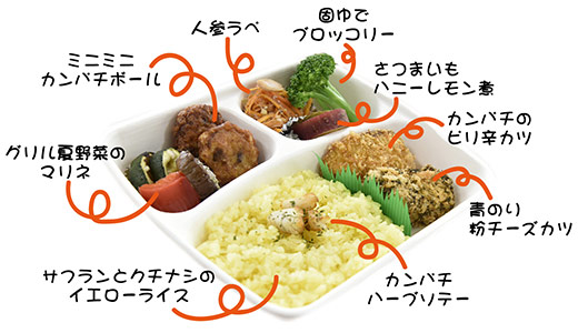 カンパチボール、カンパチのハーブソテー、ピリ辛・青のりチーズカツなど、”カンパチづくし”の洋風お弁当です 。